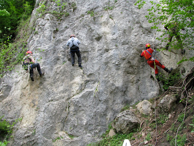 Urmatorul punct de control a venit repede, si am mai bagat niste fructe uscate, dupa care, incetul cu incetul, drumul a inceput sa urce pana am iesit in soseaua de Stana de Vale. Intr-adevar, urcarea este deosebit de dura, mai ales dupa 90 km de pedalat. Cred ca asa, facuta "de dimineata", ar fi fost foarte fun. Nu ne-a fost greu, dar a fost un pic demoralizanta, stiind ca e cea mai grea bucata din traseu (nu era de fapt, dupa parerea mea). Ne-am mai oprit de cateva ori cate 1 minut, sa nu ne blocam muschii si, dupa mai bine de o ora, am ajuns in varf. De aici a urmat o coborare lunga pe Valea Iadului, pana la Lesu, vale care e adanca si foarte rece si care a facut multe victime printre cei care au intrat pe ea incalziti de pe urcare si in tricou.